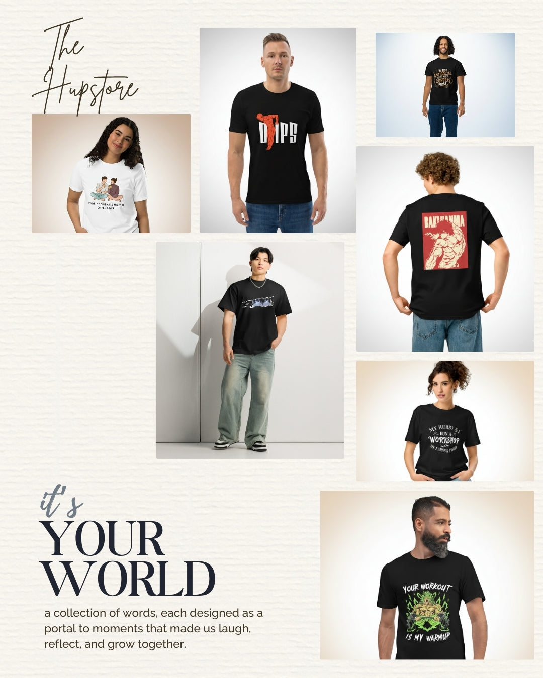 Welcome to The Hupstore - where self-expression meets streetwear. We believe clothes should talk for you, especially when you don't feel like talking. Whether you're a gym freak, coffee worshipper, sarcastic soul, or a chaotic couple, there's something here with your vibe printed on it. Our designs? Bold but wearable. Our fits? Oversized and comfy. Because your t-shirt shouldn't just fit your body - it should fit your personality.